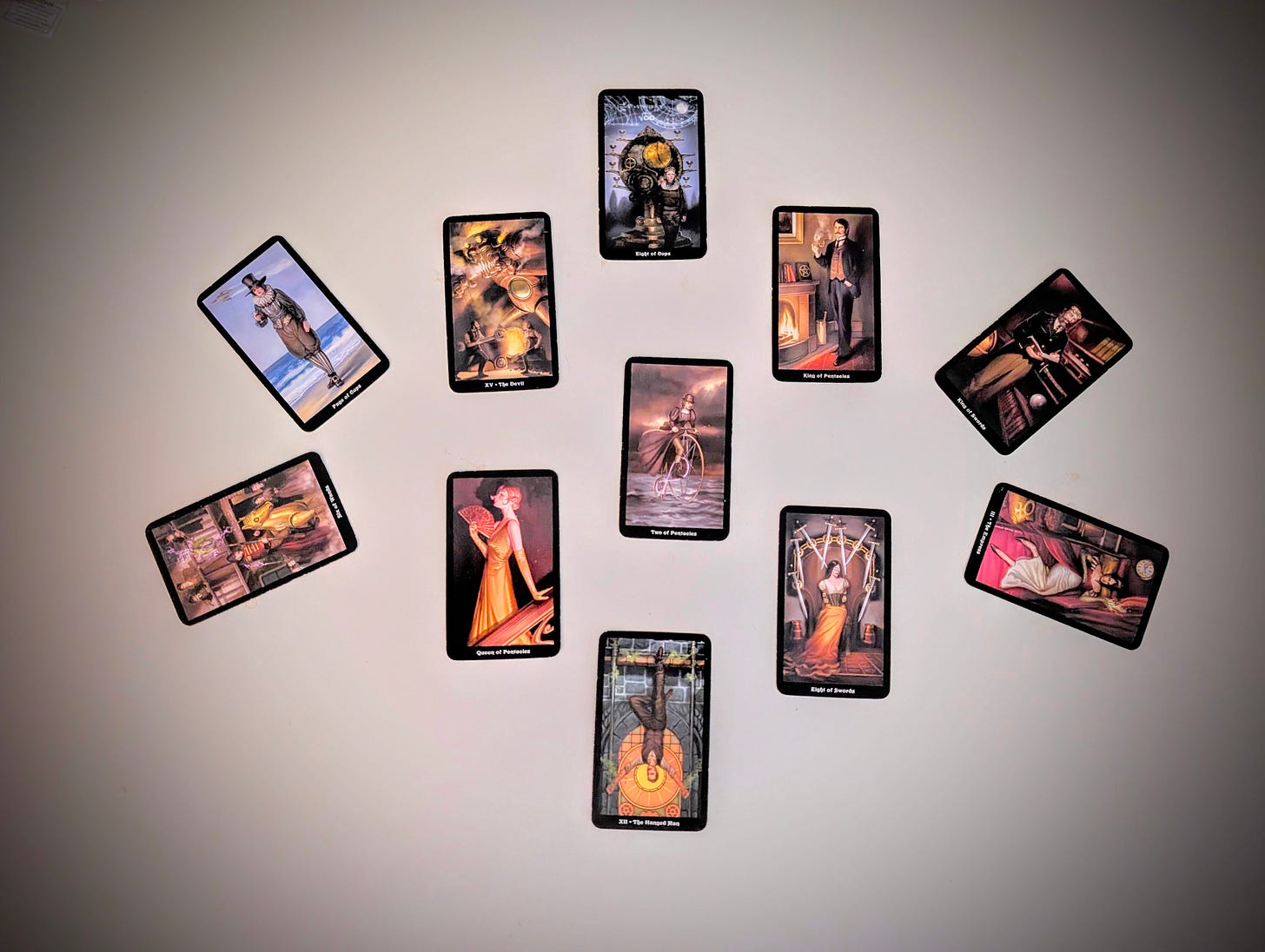 The Devil is never a truly welcome card, so I ask what mollifies ole Beelzebub. Steampunk offers the Page of Cups and the Six of Wands. Emotional curiosity instead of compulsion. Wonder instead of appetite. Feel desire fully, then listen to what it points toward. Denote wins, name progress, celebrate coherence before dissatisfaction invents lack. The Devil feeds on secrecy and unrecognized success. These two cards starve him quietly.